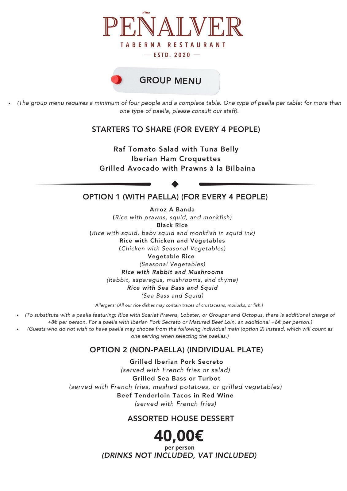 ES MENU EN MENU Carte Wines Groups Menu Carte From Alicante (Paellas) The prices of all our rice are per person. The Minimum to order is two Diners.(Minimum two people) (Price per person) (1 paella per table, more than 1 consult with the staff) Gentleman's Seafood Rice (squid , monkfish,shrimp,baby prawns, mussel meat) Allergies: Crustacean, Mollusks and fish. ● 27,50 (per diner) Black Ricecuttlefish ( squid ,monkfish,squid) Allergies: Crustacean, Mollusks and fish. ● 22,50 (per diner) Mixed Rice (chicken or pork meat, Prawns, squid, baby squid and monkfish) Allergies: Crustacean, Mollusks and fish. ● 27,50 (per diner) Vegetable Rice (Seasonal vegetables) Allergies: It might contain traces of crustacean, mollusks and fish. ● 19,00 (per diner) Rice with Chicken and Vegetables (Seasonal vegetables and chicken meat) Allergies: It might contain traces of crustacean, mollusks and fish. ● 21,00 (per diner) Rice with Grouper and Octopus (Grouper and octopus) Allergies: Crustacean, Mollusks and fish. ● 26,50 (per diner) Seafood Rice (Prawns, monkfish, squid, shrimp, and baby squid) Allergies: Crustacean, Mollusks and fish. ● 27,50 (per diner) Crusted Rice (Chorizo, chickpeas, lean pork, blood sausage, and alioli) Allergies: It might contain traces of crustacean, mollusks and fish. ● 24,50(per diner) Rice with Lobster Allergies: Crustacean, Mollusks and fish. ● 30,00 (per diner) band rice (squid ,snuff and shrimp) Allergies: Crustacean, Mollusks and fish. ● 21,00 (per diner) Rice with Rabbit and Mushrooms (Rabbit, mushrooms, and thyme) Allergies: It might contain traces of crustacean, mollusks and fish. ● 24,50 (per diner) Rice with Ibérico Secret (Ibérico secret pork cut and mushrooms, asparagus, and thyme) Allergies: It might contain traces of crustacean, mollusks and fish. ● 26,00 (per diner) Gentleman's Seafood Noodle (Shrimp, Squid, Monkfish, Baby Prawns and mussel meat) Allergies: Crustacean, Mollusks and fish. ● 27,50 Rice with matured Sirloin Steak Allergies: It might contain traces of crustacean, mollusks and fish. ● 29,50 Rice with sea bass and squid ● 24,00 From close to home Rice & Roast Pepper Morcilla ● 14,00 Iberic Ham Croquettes 5(pcs) ● 16,00 Navarre Sausage ● 16,00 Torreznos from Soria ● 16.00 Ibéric Ham 100% Bellota ● 30,00 Salmorejo Cordobes ○ 9.50 Cured Cheese ● 16,00 Assortment of Iberian Sausages ● 13.50 Fish Andalusian Achovies ○ 8 ● 14,00 Cantabrian Achovies en canned ● 24,00 Anchovies in Vinegar ● 15,50 Grilled Turbot Fish ● 24,00 Grilled Sea Bass ● 24,00 To eat with spoon (Minimum two people) (Price per person) Rice with Lobster Allergies: Crustacean, Mollusks and fish. ● 30,00 (per diner) Pumpkin end Ginger cream ● 9,50 Rice with Grouper and Octopus Allergies: Crustacean, Mollusks and fish. ● 26,50 (per diner) From the vegetable garden Tuna Belly Salad with Raf Tomato ● 17,00 Tomato,Parmesan,Iberico Ham and Basil ● 18,50 Russian Salad ○ 9,00 ● 15,00 Tuna Belly with roasted Peppers ● 17,00 Grilled Vegetables ● 16,00 Padron Peppers ● 14,00 From the sea Garlic-Grilled Small Scallops ● 17,50 Grilled Cuttlefish ● 13,5 Grilled Octopus ● 27,00 Garlic King Prawn ● 17,00 Andalusian Style Tiny Cuttlefish ● 13,5 Vinegar Marinated Tope Shark ● 14,50 Grilled Squid ● 19,00 Galician Octopus ● 22,00 Andalusian-style calamari ● 19,50 To share Huevos rotos (broken eggs) with iberico ham ● 20,00 Omelette with Potato ● 18,00 Galician octopus Omelette ● 22,50 Meat Austrian Cow Tenderloin with Parisian Sauce ● 28,00 Chicken filet with mustard & honey ● 16,50 Matured Sirloin Steak ● 27,50 Suckling lamb chops ● 25,00 Grilled Iberic secret with fries. ● 24,00 Pieces of beef tenderloin in red wine ● 22,00 Artisan-made Ice cream 100% handmade Vanilla Ice Cream Gold ● 7,00 Turron Ice Cream ● 7,00 Ice Cream Chocolate Belga ● 7,00 Pistacho ice cream ● 7,00 Desserts Cheese Cake ● 8.50 White Chocolate Coulant ● 7,00 Pineapple and Mango Carpaccio with Mango Sorbet Thin slices of fruit accompanied by the freshness of a sorbet ● 8,50 Pistachio Coulant ● 7,00 Side dishes Roasted peppers ○ 5,00 Aioli Sauce ● 1,00 Mashed Potatoes ● 5 Fries ● 5 Table Service, Appetizer and Bread Extra Virgen Olive Oil and Bread ● 2,40 Plastic Bag & Tupperware ● 0,5 Bread ● 1 Wines Red wines Nothing Found It seems we can’t find what you’re looking for. White wines Nothing Found It seems we can’t find what you’re looking for.